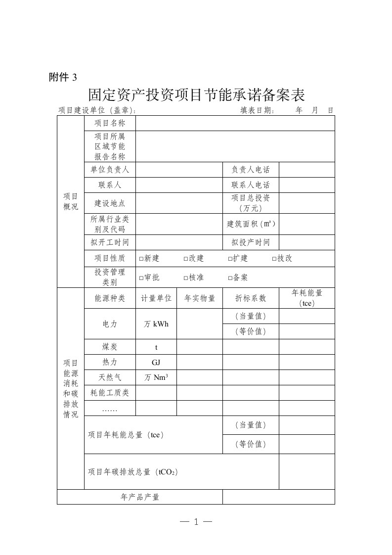【天津区域节能评估】固定资产投资项目节能承诺备案表