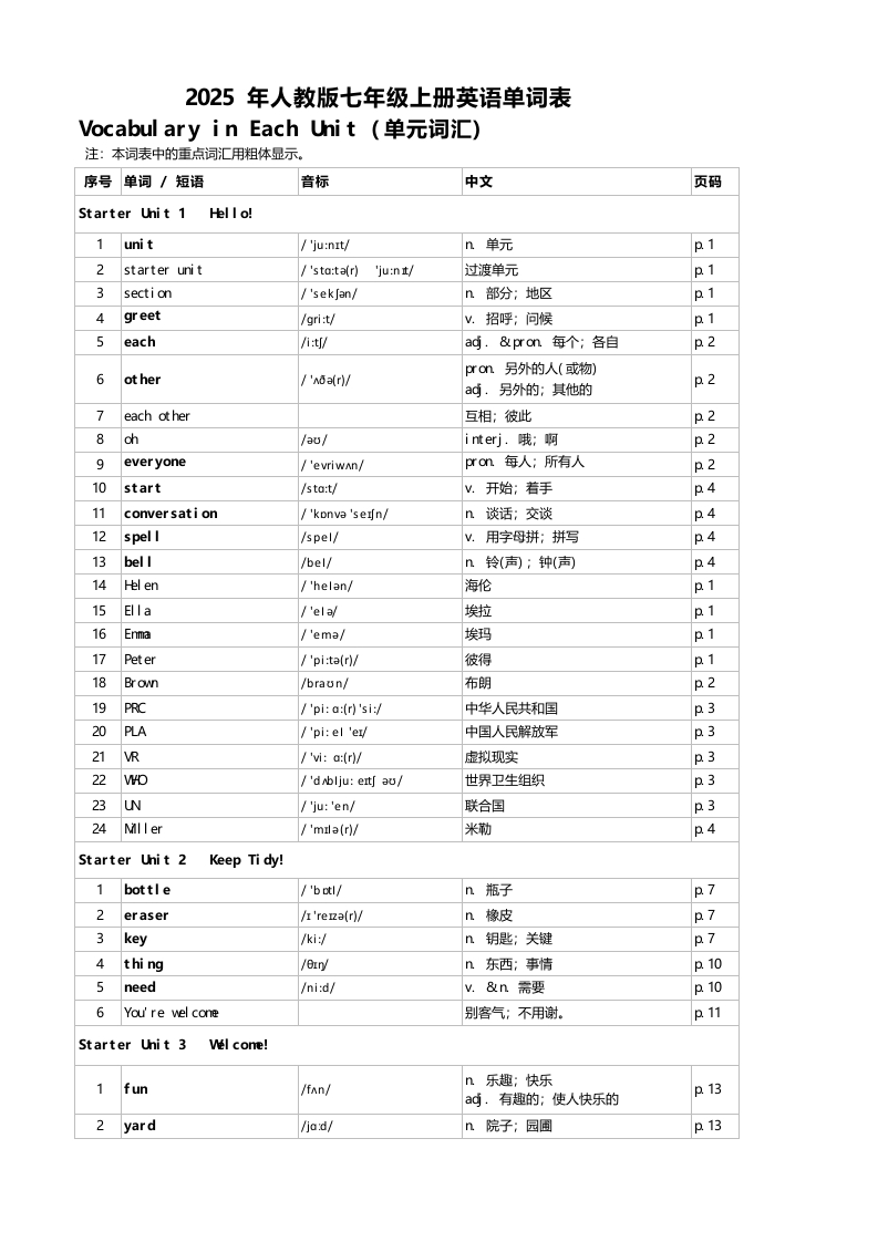2025年人教版七年级上册英语单词表