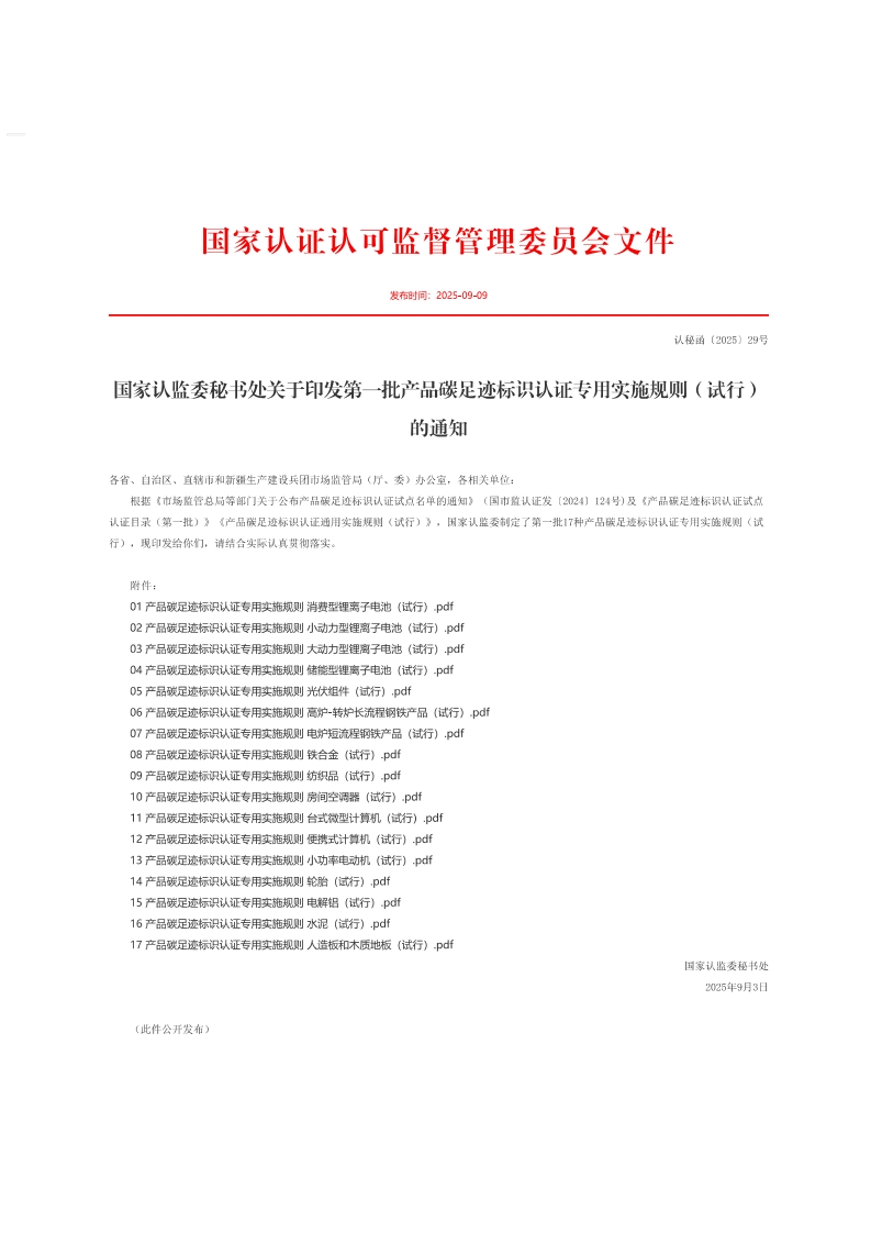 (完整版)国家认监委秘书处关于印发第一批产品碳足迹标识认证专用实施规则(试行)的通知
