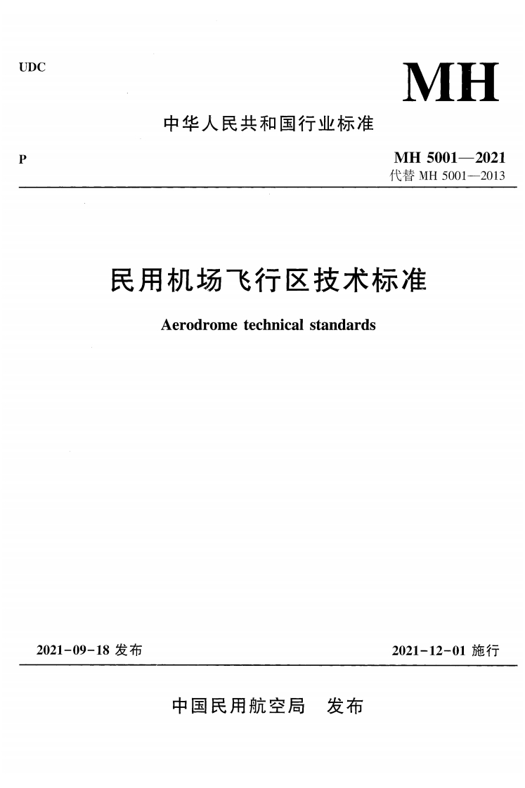 行业标准《民用机场飞行区技术标准》MH 5001-2021 代替 MH 5001-2013