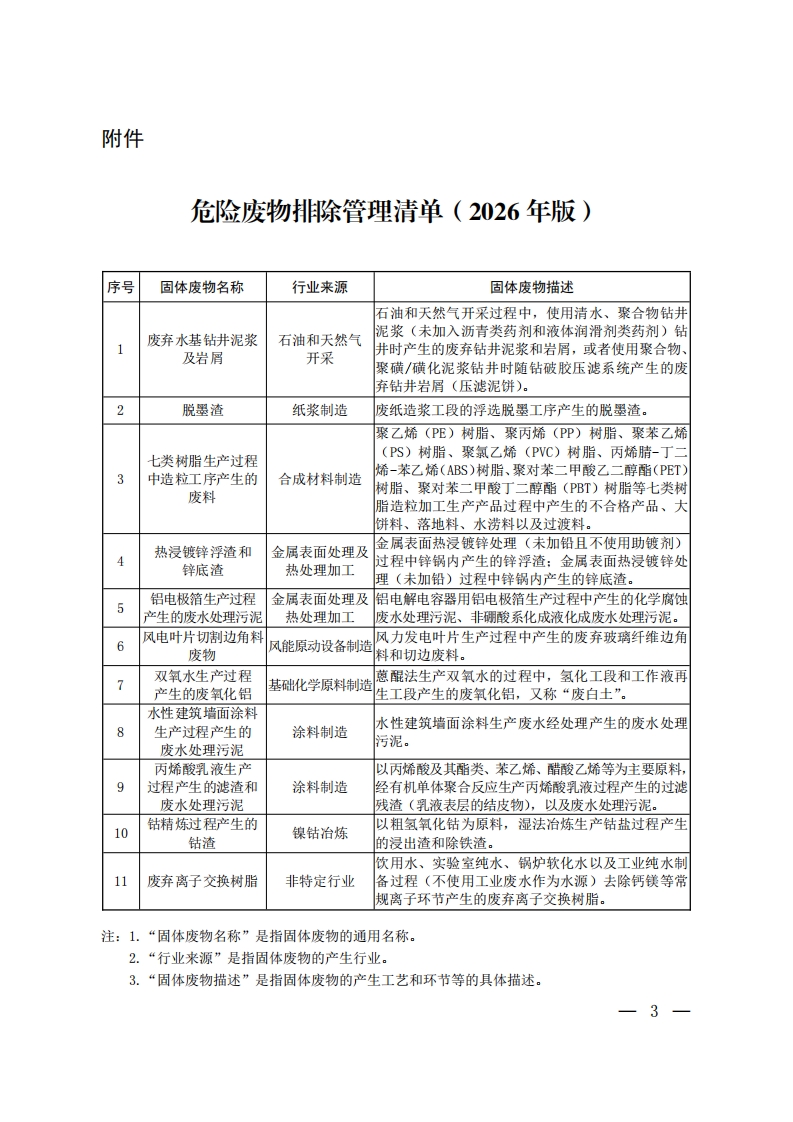 首页国家标准/地方标准政策文件生态环境部《危险废物排除管理清单(2026年版)》