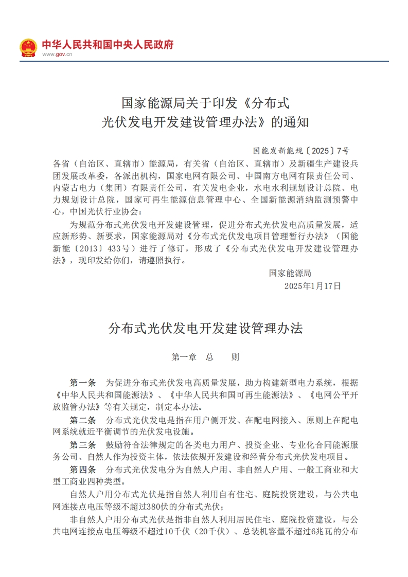 国家能源局关于印发《分布式光伏发电开发建设管理办法》的通知(国能发新能规〔2025 〕7号)