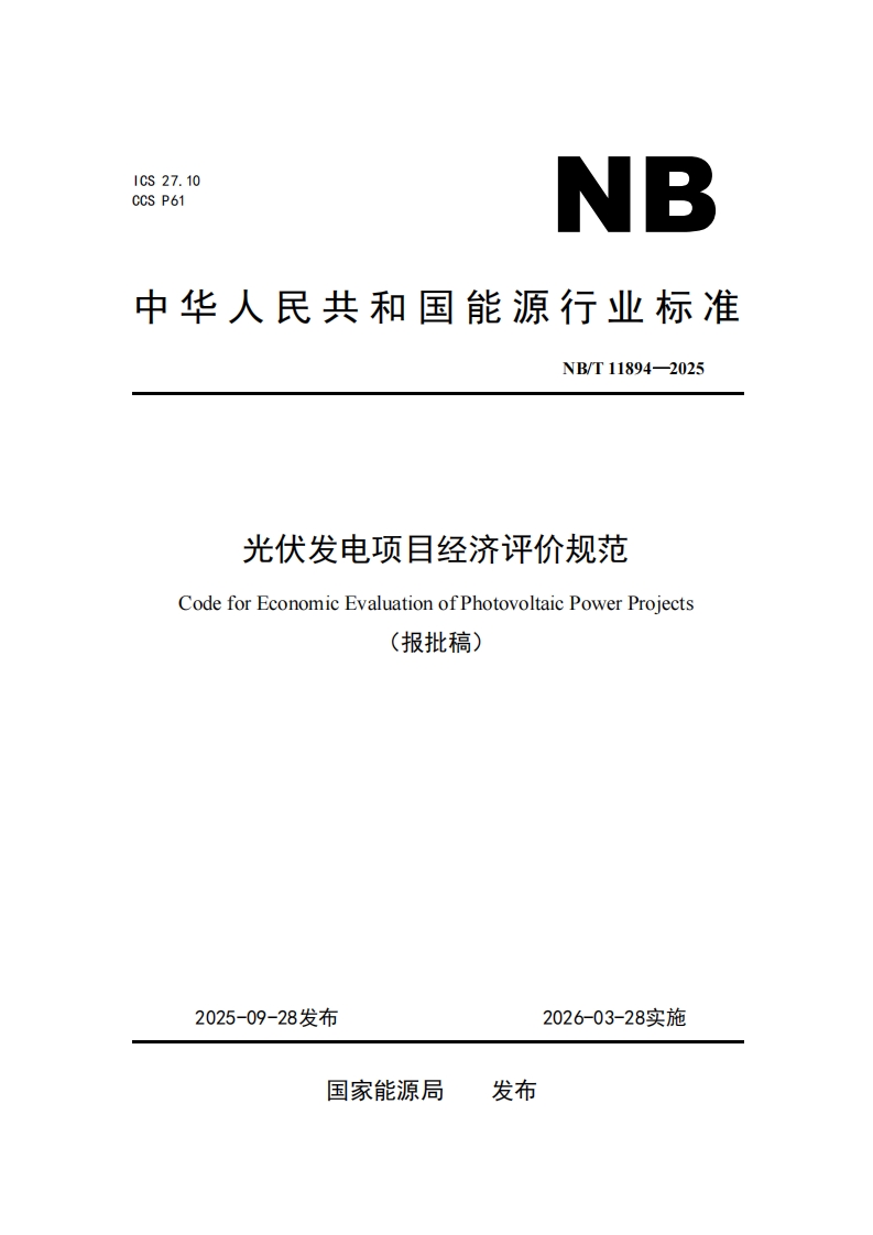 能源行业标准《光伏发电项目经济评价规范》(NBT 11894-2025)