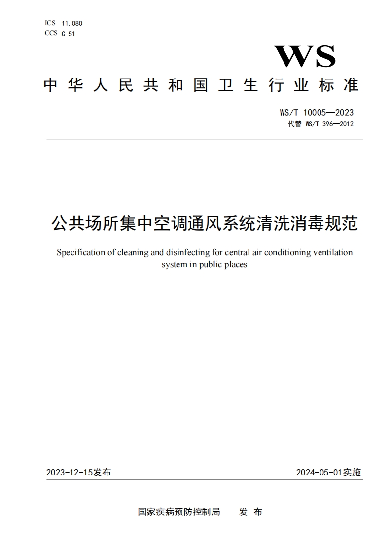 卫生行业标准《公共场所集中空调通风系统清洗消毒规范》WST 10005-2023 代替 WST 396-2012