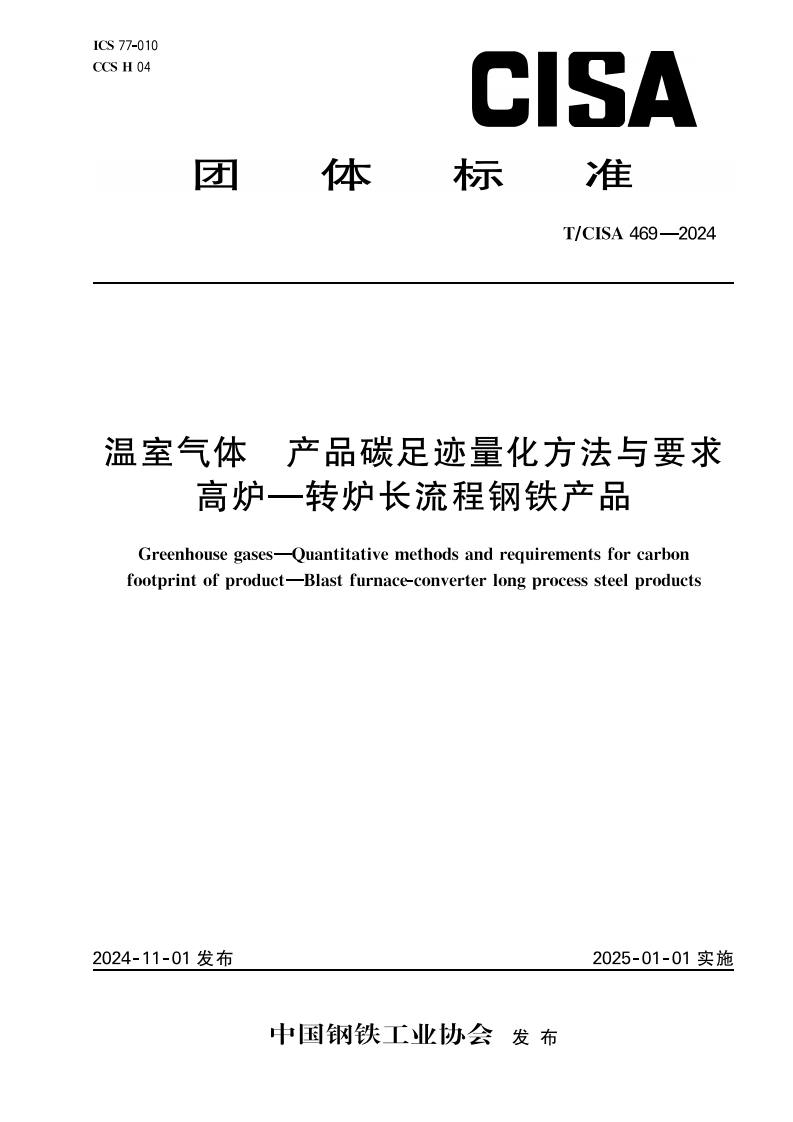 《温室气体 产品碳足迹量化方法与要求 高炉-转炉长流程钢铁产品》TCISA 469-2024