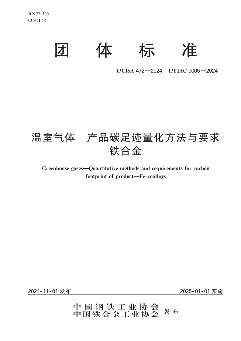 《温室气体 产品碳足迹量化方法与要求 铁合金》TCISA 472-2024,TFIAC 0005-2024