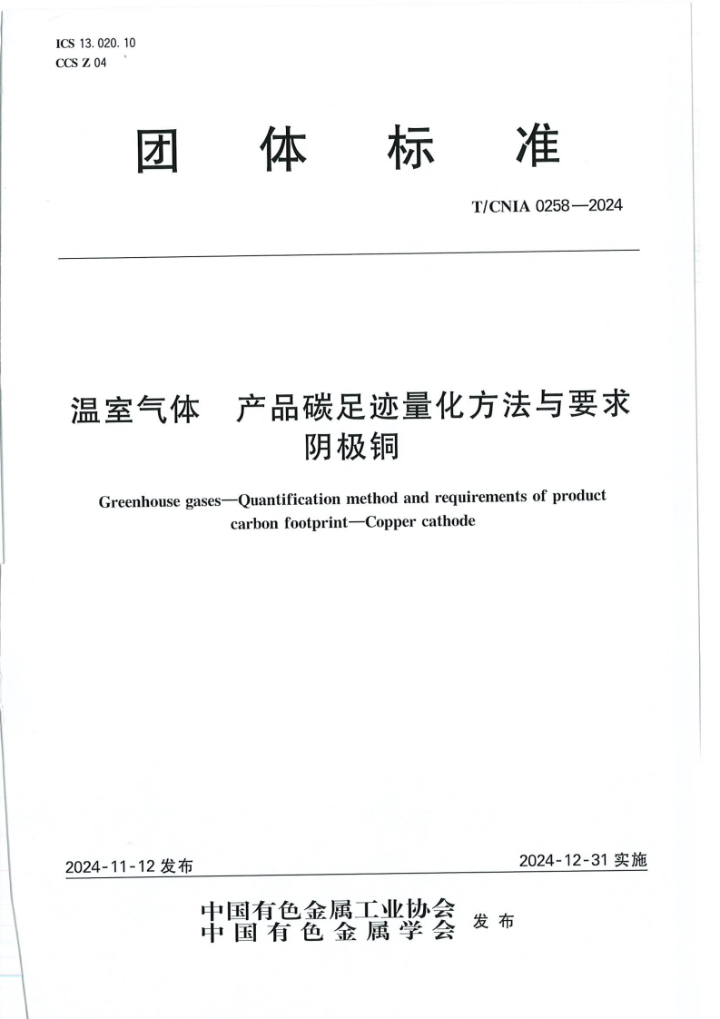 《温室气体 产品碳足迹量化方法与要求 阴极铜》TCNIA 0258-2024