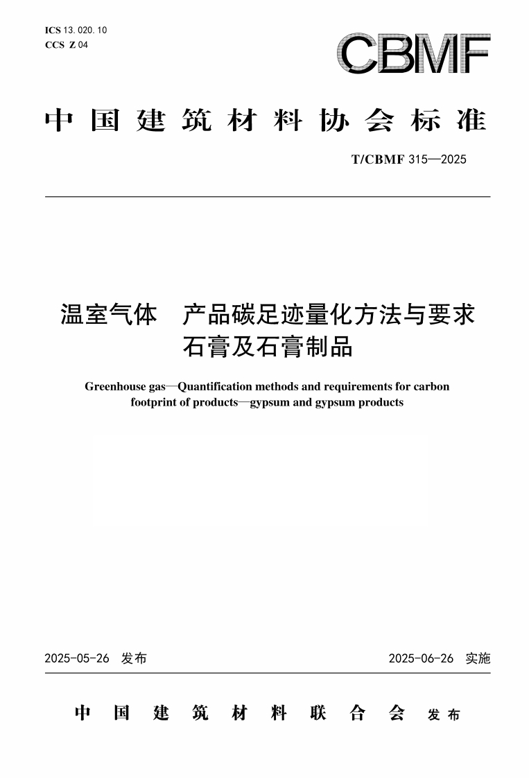 《温室气体 产品碳足迹量化方法与要求 石膏及石膏制品》TCBMF 315-2025