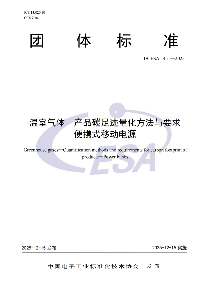《温室气体 产品碳足迹量化方法与要求 便携式移动电源》TCESA 1451-2025