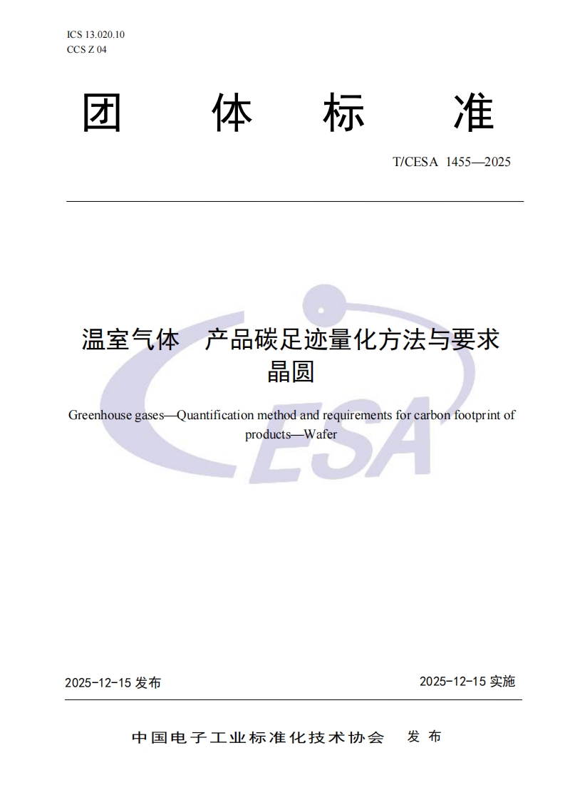《温室气体 产品碳足迹量化方法与要求 晶圆》TCESA 1455-2025