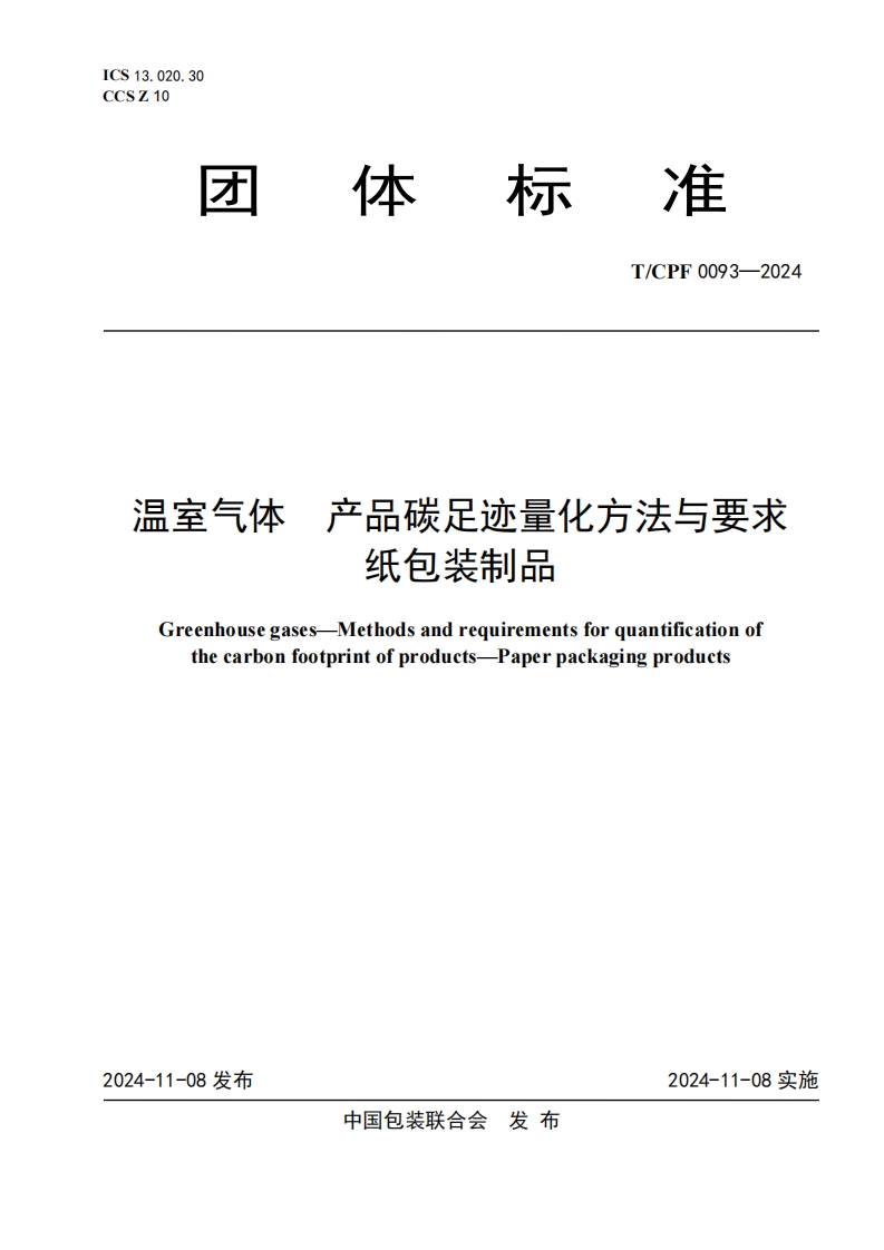 《温室气体 产品碳足迹量化方法与要求 纸包装制品》TCPF 0093-2024