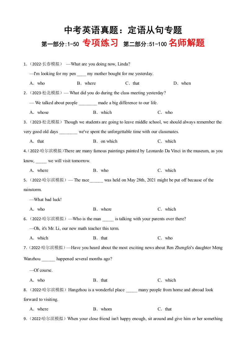 首页教育资源初中中考英语定语从句真题练习题及答案